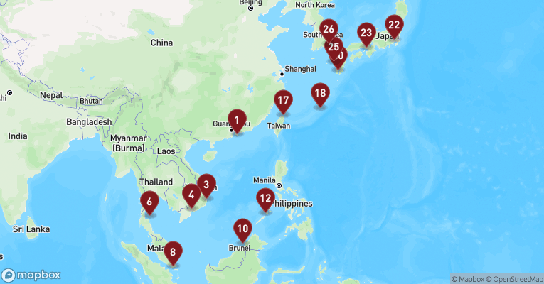 Sultanatet Brunei er beliggende på Borneo omgivet af frodige regnskove, og Bandar Seri Begawan er landets elegante hovedstad. Brunei regeres af en sultan, som er blandt verdens rigeste mænd, og Royal Regalia museet er dedikeret til ham, fortæller historien om hans liv og er fyldt med overdådige regalier såsom hans gyldne trone. Gylden er også kuplen på byens ikoniske moské, der spejler sig i en smaragdgrøn lagune og fremstår som et sandt eventyr i islamisk arkitektur. Byens livlige hjerte findes dog ved Kampong Ayer – verdens største vandlandsby, hvor farverige træhuse, der er bygget på pæle over vandet, huser omkring 13.000 mennesker. Her kan du sejle ad de smalle kanaler og få et glimt af det autentiske liv langs floden. Udover disse fascinerende boliger finder du også skoler, moskéer, markeder og endda en brandstation her – alt sammen bygget på pæle og forbundet af lange træbroer. Til trods for moderne faciliteter som aircondition og internet, har ”Østens Venedig”, som området ofte kaldes, bevaret sin traditionelle charme. I den nærliggende nationalpark svæver hængebroer over regnskovens tætte trækroner, mens vilde aber svinger sig gennem luften i Borneos vilde natur.