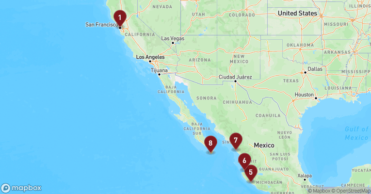 Manzanillo blev grundlagt som havn i 1500-tallet, da spanske skibe sejlede over Stillehavet med guld og silke. I dag er det fiskeriet, der definerer byen, og sværdfisken er blevet dens symbol - hyldet i en stor blå skulptur ved havnen og i de mange konkurrencer, der hvert år trækker sportsfiskere til. Centrum er præget af pladser, kirker og små butikker, hvor duften af kaffe og krydderier driver gennem de varme gader, og på markederne sælges friskfanget fisk direkte fra havet. Bugterne på begge sider af byen er vidt forskellige: mod nord finder du lange sandstrande med stille vand, mens bølgerne mod syd tiltrækker surfere. Baglandet hæver sig dramatisk med Colima-vulkanen, der er en af landets mest aktive, og på de grønne skråninger dyrkes kaffe, som siden kolonitiden har været områdets eksportvare. I bjergene ligger også Sierra de Manantlán Biosphere Reserve, et UNESCO-område med regnskov, vandfald og et enestående dyre- og planteliv. Her lever både jaguarer, pumaer og de smukke trogoner med farvestrålende fjerpragt.
