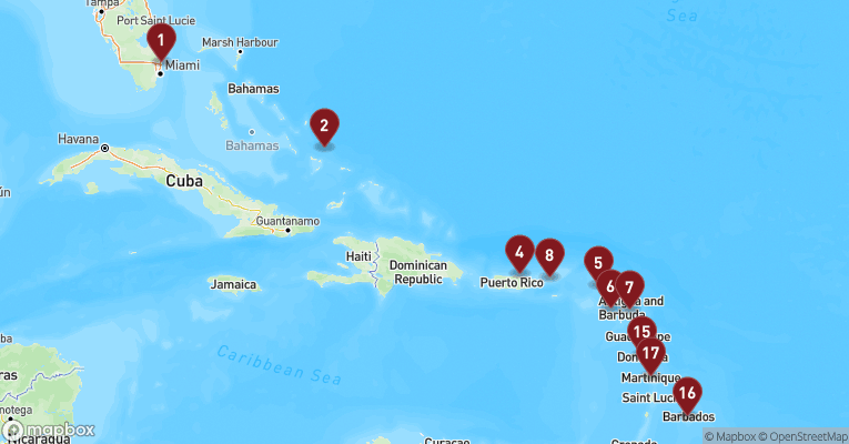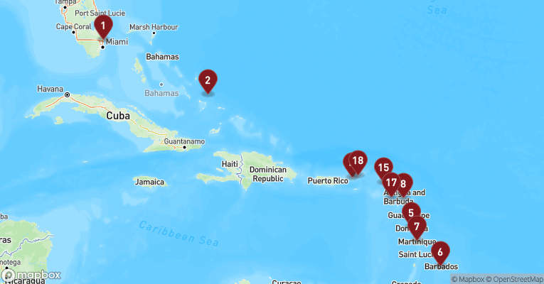 Farverige træhuse med udskårne verandaer, afskallede facader og bliktag i rødt og turkis sætter kulør på St. John’s, Antiguas lille, livlige hovedby. Byens centrum er overskueligt og levende, og her finder du både kolonihistoriske bygninger og små lokale museer, som giver et indblik i øens britiske arv og afrocaribiske kultur. I havnen ligger farverige fiskerbåde side om side med store krydstogtskibe, og fra den lille promenade er der udsigt over Det Caribiske Havs klare blå nuancer. Ikke langt fra byen ligger nogle af Antiguas største seværdigheder: Nelson’s Dockyard i English Harbour er en velbevaret flådebase fra 1700-tallet, hvor du kan gå mellem gamle stenhuse og mastekraner og få et glimt af livet under Royal Navy. Området er på UNESCO's verdensarvsliste og oser af maritim historie. Kører du videre op ad bjergvejene, når du til Shirley Heights, der er en tidligere udkigspost med storslået udsigt over bugten og havet. Øen er kendt for sine mange strande - faktisk én for hver dag i året, som man siger - og du finder alt fra stille laguner til strækninger med bølger og liv. Antigua er rig på historie, men det er også en ø, hvor rytmen er afslappet, og naturen altid lige om hjørnet.