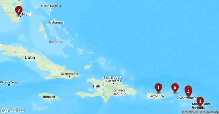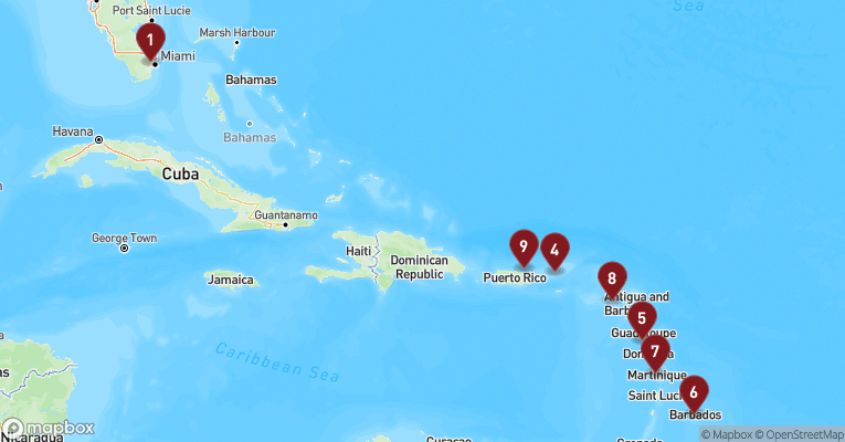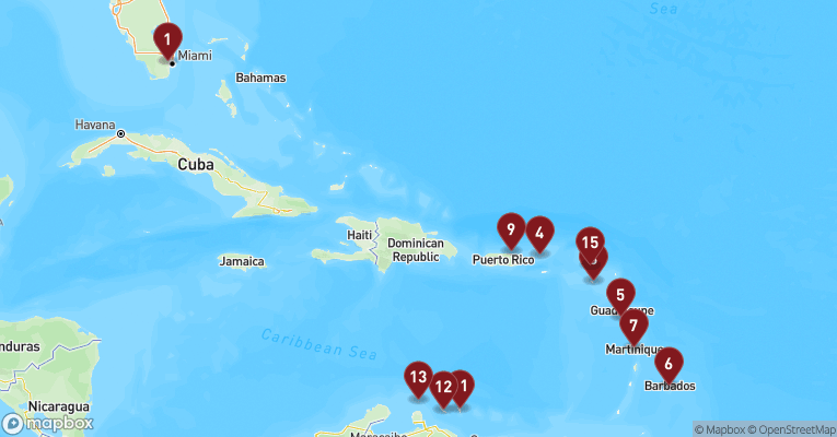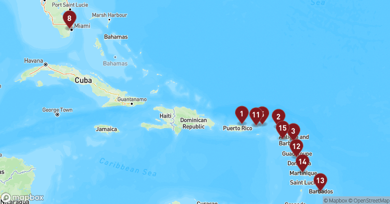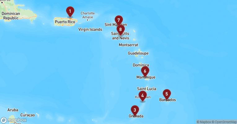 Castries er hovedstaden på St. Lucia og en farverig blanding af caribisk livsglæde, kolonihistorie og tropisk natur. Gaderne dufter af krydderier, frugt og hav, og de små markedsboder bugner af håndlavet kunsthåndværk og modne mangoer. Byens placering i en bugt med grønne bjerge i baggrunden gør den til et smukt udgangspunkt for udflugter ind i øens frodige indre. En dag her kan tage dig til det berømte udsigtspunkt Morne Fortune, hvor du får panorama over byen og havnen, og videre sydpå til Soufrière-regionen med dens boblende svovlkilder og St. Lucias stolte vartegn – de to grønklædte tvillingebjerge Pitons, der rejser sig dramatisk op af det azurblå hav. Du kan bade i varme mineralbade, besøge en kakaoplantage eller sejle langs vestkysten, hvor fiskerlandsbyer, palmefyldte strande og koralrev afløser hinanden. Øens vulkanske oprindelse mærkes overalt – i jorden, i landskabet og i de sorte sandstrande. Og midt i det hele venter den varme, rytmiske puls fra en befolkning, der møder dig med smil, stolthed og et "Welcome to paradise", der føles helt ægte.
