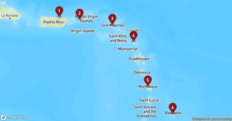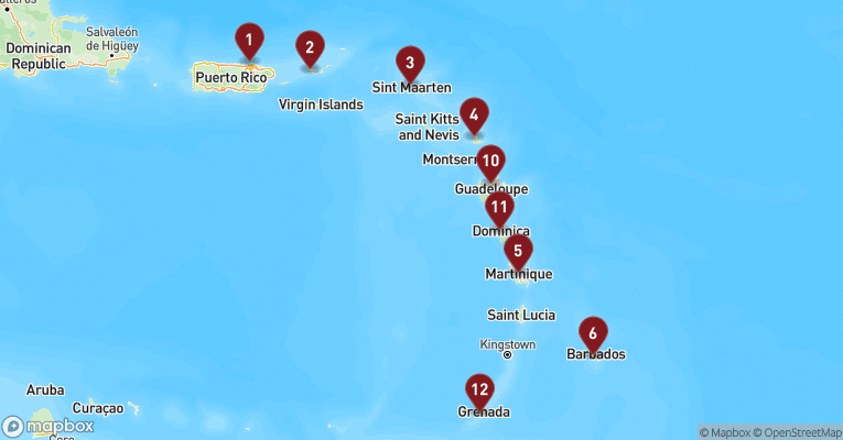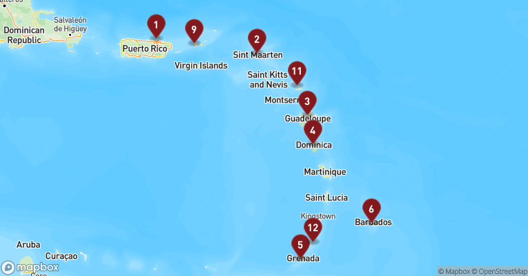 Farverige træhuse med udskårne verandaer, afskallede facader og bliktag i rødt og turkis sætter kulør på St. John’s, Antiguas lille, livlige hovedby. Byens centrum er overskueligt og levende, og her finder du både kolonihistoriske bygninger og små lokale museer, som giver et indblik i øens britiske arv og afrocaribiske kultur. I havnen ligger farverige fiskerbåde side om side med store krydstogtskibe, og fra den lille promenade er der udsigt over Det Caribiske Havs klare blå nuancer. Ikke langt fra byen ligger nogle af Antiguas største seværdigheder: Nelson’s Dockyard i English Harbour er en velbevaret flådebase fra 1700-tallet, hvor du kan gå mellem gamle stenhuse og mastekraner og få et glimt af livet under Royal Navy. Området er på UNESCO's verdensarvsliste og oser af maritim historie. Kører du videre op ad bjergvejene, når du til Shirley Heights, der er en tidligere udkigspost med storslået udsigt over bugten og havet. Øen er kendt for sine mange strande - faktisk én for hver dag i året, som man siger - og du finder alt fra stille laguner til strækninger med bølger og liv. Antigua er rig på historie, men det er også en ø, hvor rytmen er afslappet, og naturen altid lige om hjørnet.