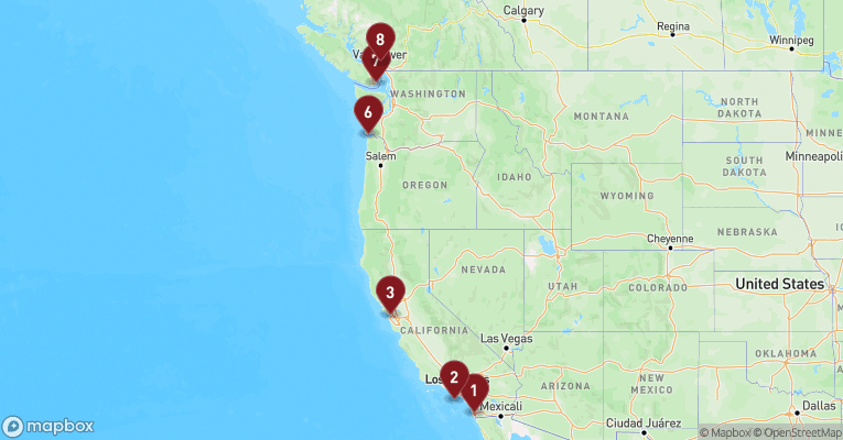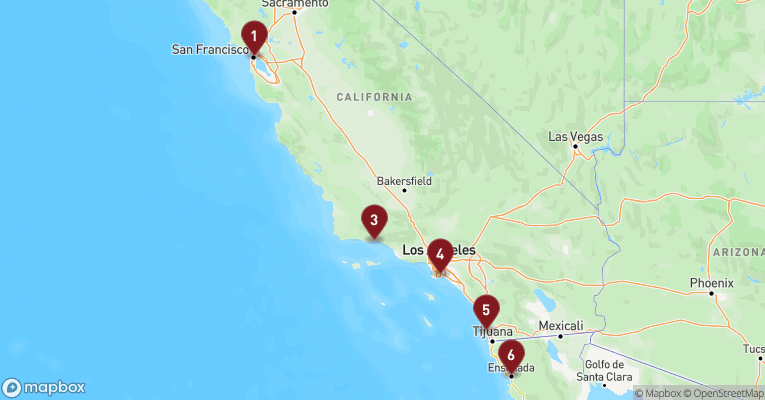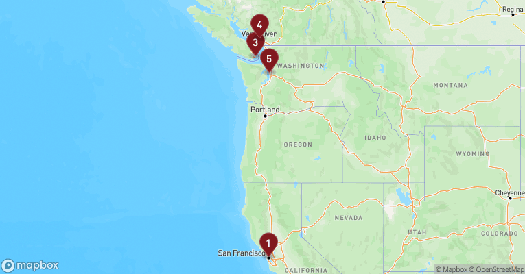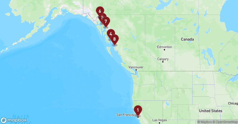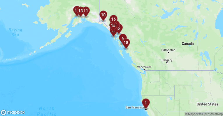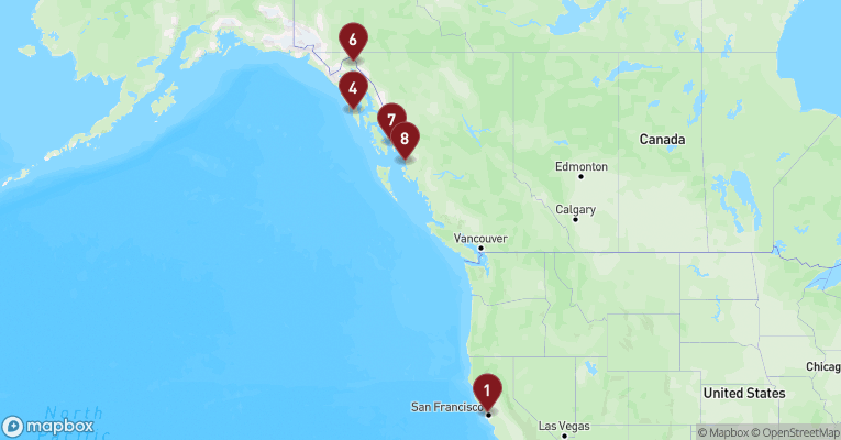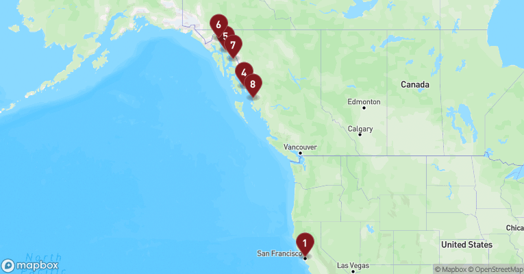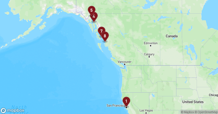 San Francisco er en af verdens 4 smukkest beliggende storbyer - og helt fortryllende bliver det når byen opleves fra søsiden. Golden Gate bridge står majestætisk og byder sørejsende velkommen. Der er oser af liv og stemning i omkiring Fishermens Wharf mens byens stejle bakker og de historiske kabelsporvogn præger bybilledet. Nærheden til vinregionen Napa Valley tilføjer en ekstra dimension med let adgang til lækkerier for ganen.