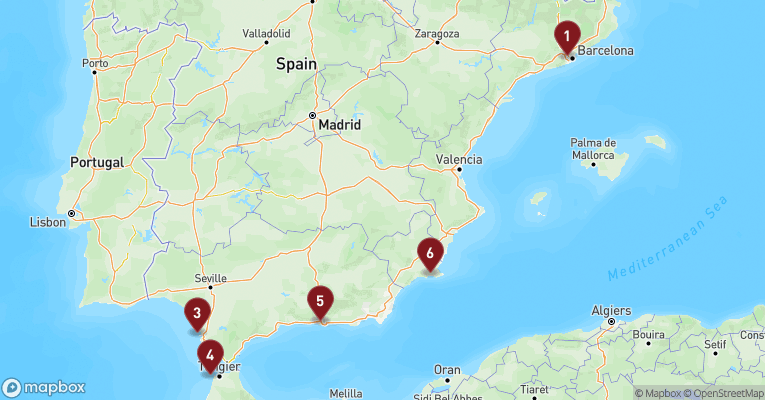 Den catalanske storby Barcelona er Spaniens andenstørste og behøver næppe nogen præsentation. Barcelona har alt, hvad en moderne storby skal have, og mere til. Den er berømt for Gaudis fantasifulde arkitektur, og her vrimler det med seværdigheder som hans finurlige Sagrada Familia og det imponerende fodboldstadion, Camp Nou foruden utallige interessante museer som f.eks. Picassomuseet. Fra Montjuic-bjerget har du en formidabel udsigt over byen, og stemningen på det berømte hovedstrøg, Ramblaen, er i sig selv en oplevelse. Her kan du sagtens få timer til at gå med at betragte menneskemylderet, mens du nyder lækre tapas og boblende cava.