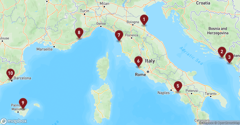 Ravenna ser måske stille ud på overfladen, men bag murene gemmer sig en af Europas mest spektakulære samlinger af mosaikker. Byen har hele otte steder på UNESCO's verdensarvsliste, og de små glasstykker i guld, blå og grønne nuancer danner billeder, der har overlevet i mere end 1.500 år. Basilica di San Vitale er højdepunktet - et bygningsværk fra det 6. århundrede, hvor vægge og kuppel er dækket af scener fra Bibelen udført i en detaljegrad, der stadig imponerer. Sammen med de øvrige kirker og mausoleer giver San Vitale et unikt indblik i den tid, hvor Ravenna var centrum for det vestromerske rige. Byen rummer også Dantes grav, hvor Italiens nationaldigter ligger begravet efter sine sidste år i eksil. Den enkle marmorsarkofag tiltrækker hvert år både litteraturinteresserede og besøgende, der vil mindes forfatteren til Den Guddommelige Komedie. Selve byen er præget af rolige gader, små torve og caféer, hvor hverdagslivet foregår i skyggen af historien. Og kun få kilometer væk lokker Adriaterhavet med brede strande og fyrreskove ved Marina di Ravenna - et oplagt modstykke til den koncentrerede kulturarv i byens centrum.