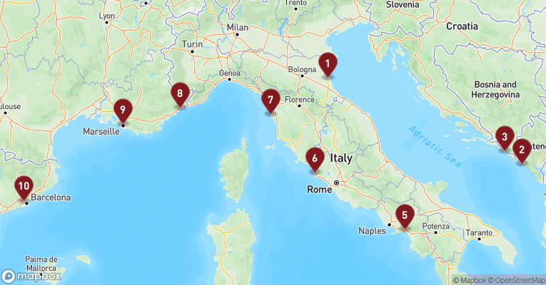 Ravenna ser måske stille ud på overfladen, men bag murene gemmer sig en af Europas mest spektakulære samlinger af mosaikker. Byen har hele otte steder på UNESCO's verdensarvsliste, og de små glasstykker i guld, blå og grønne nuancer danner billeder, der har overlevet i mere end 1.500 år. Basilica di San Vitale er højdepunktet - et bygningsværk fra det 6. århundrede, hvor vægge og kuppel er dækket af scener fra Bibelen udført i en detaljegrad, der stadig imponerer. Sammen med de øvrige kirker og mausoleer giver San Vitale et unikt indblik i den tid, hvor Ravenna var centrum for det vestromerske rige. Byen rummer også Dantes grav, hvor Italiens nationaldigter ligger begravet efter sine sidste år i eksil. Den enkle marmorsarkofag tiltrækker hvert år både litteraturinteresserede og besøgende, der vil mindes forfatteren til Den Guddommelige Komedie. Selve byen er præget af rolige gader, små torve og caféer, hvor hverdagslivet foregår i skyggen af historien. Og kun få kilometer væk lokker Adriaterhavet med brede strande og fyrreskove ved Marina di Ravenna - et oplagt modstykke til den koncentrerede kulturarv i byens centrum.