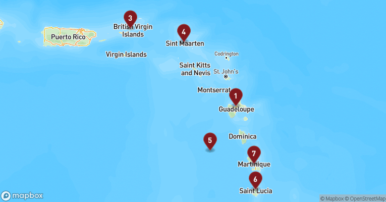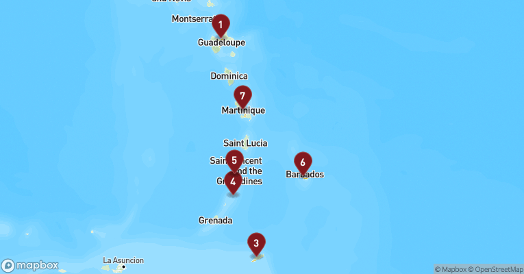 Castries er hovedstaden på St. Lucia og en farverig blanding af caribisk livsglæde, kolonihistorie og tropisk natur. Gaderne dufter af krydderier, frugt og hav, og de små markedsboder bugner af håndlavet kunsthåndværk og modne mangoer. Byens placering i en bugt med grønne bjerge i baggrunden gør den til et smukt udgangspunkt for udflugter ind i øens frodige indre. En dag her kan tage dig til det berømte udsigtspunkt Morne Fortune, hvor du får panorama over byen og havnen, og videre sydpå til Soufrière-regionen med dens boblende svovlkilder og St. Lucias stolte vartegn – de to grønklædte tvillingebjerge Pitons, der rejser sig dramatisk op af det azurblå hav. Du kan bade i varme mineralbade, besøge en kakaoplantage eller sejle langs vestkysten, hvor fiskerlandsbyer, palmefyldte strande og koralrev afløser hinanden. Øens vulkanske oprindelse mærkes overalt – i jorden, i landskabet og i de sorte sandstrande. Og midt i det hele venter den varme, rytmiske puls fra en befolkning, der møder dig med smil, stolthed og et "Welcome to paradise", der føles helt ægte.