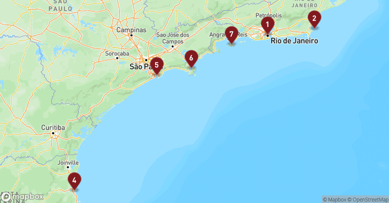 Itajaí er en af Brasiliens vigtigste havnebyer og ligger, hvor floden af samme navn løber ud i Atlanterhavet, omgivet af grønne bakker og brede sandstrande. Byen har rødder i både portugisisk og tysk indvandring, hvilket stadig kan ses i arkitekturen, madkulturen og de årlige festivaler. På en dagsudflugt kan du opleve den historiske bykerne med kirker, små museer og markeder, eller tage op til Morro da Cruz, hvorfra du har udsigt over havnen, floddeltaet og det åbne hav. Lidt uden for byen ligger nogle af Brasiliens mest populære strande - som Praia Brava, der tiltrækker både surfere og solbadere med sine stærke bølger og dramatiske klippefremspring. Hvis du vil opleve natur og dyreliv, er det muligt at tage på sejltur i flodmundingen eller besøge det nærliggende naturreservat Parque do Atalaia, hvor stier og udsigtspunkter giver dig fornemmelsen af Brasiliens vilde kystlandskab. Itajaí er også kendt som en af anløbshavnene for den internationale sejlads The Ocean Race, hvilket har givet byen et moderne maritimt præg og en livlig havnefront med restauranter og aktiviteter.